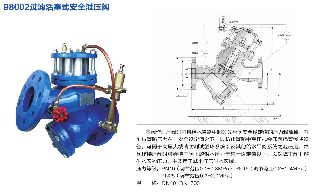 - 本閥作泄壓閥時可將給水管路中超過先導閥安全設定值的壓力釋放掉,并維持管路壓力在一安全設定值之下,以防止管路中高壓或突壓毀損管線或設備,可同于高層大樓消防測試循環(huán)系統(tǒng)以及其他平衡系統(tǒng)之泄壓用。