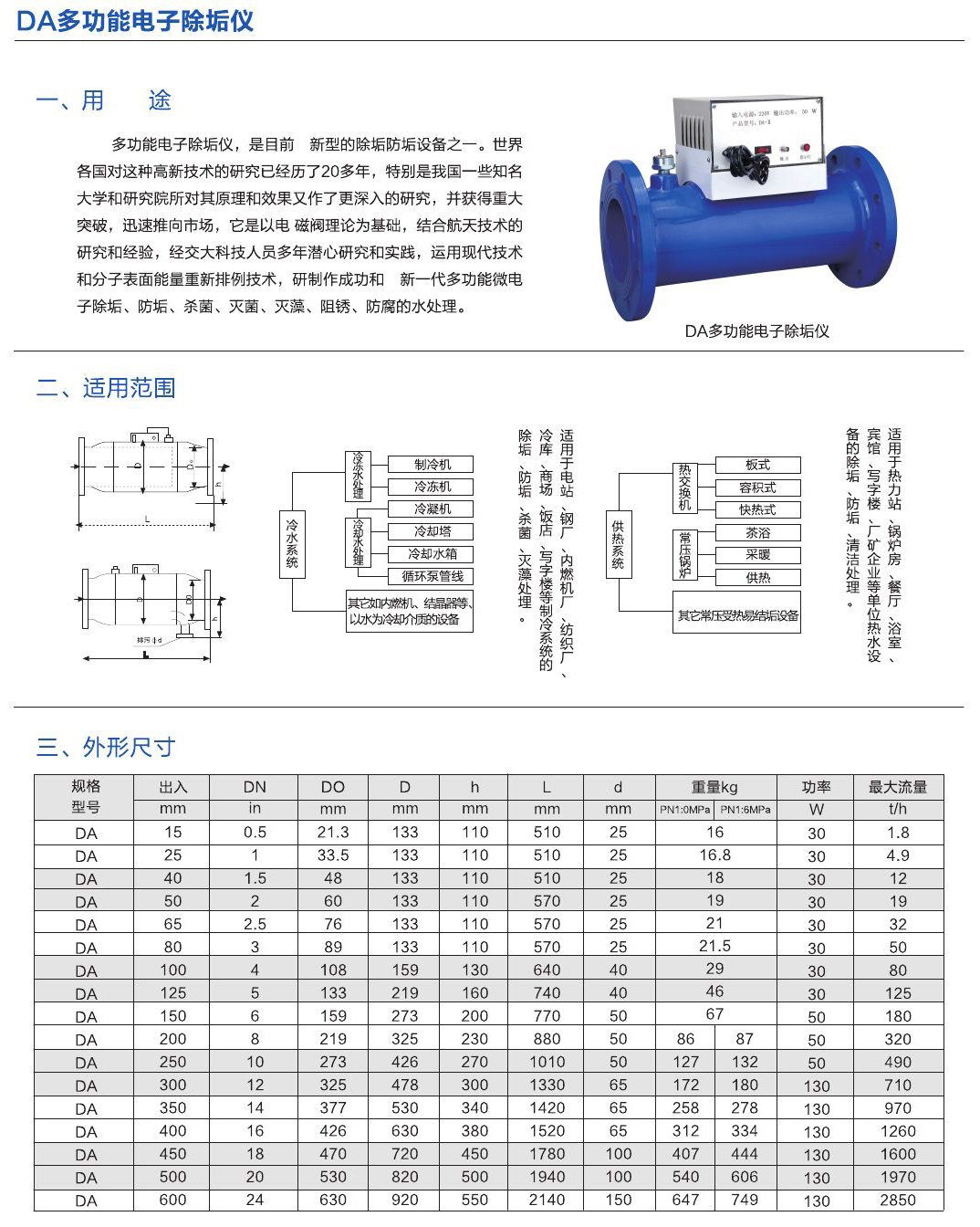 - 多功能電子除垢儀,是目前新型的除垢防垢設備之一。世界各國對這種高新技術的研究已經(jīng)歷了20多年,特別是我國一些知名大學和研究院所對其原理和效果又作了更深入的研究,并獲得重大突破,迅速推向市場,它是以電磁閥理念經(jīng)為基礎,結合航天技術的和經(jīng)驗,經(jīng)交大科技人員多年潛心研究和實踐,運用現(xiàn)代技術和分子表面能量重新排例技術,研制作成功和新一代多功能微電子除垢、防垢、殺菌、來菌、來藻、陰銹、防腐的水處理。