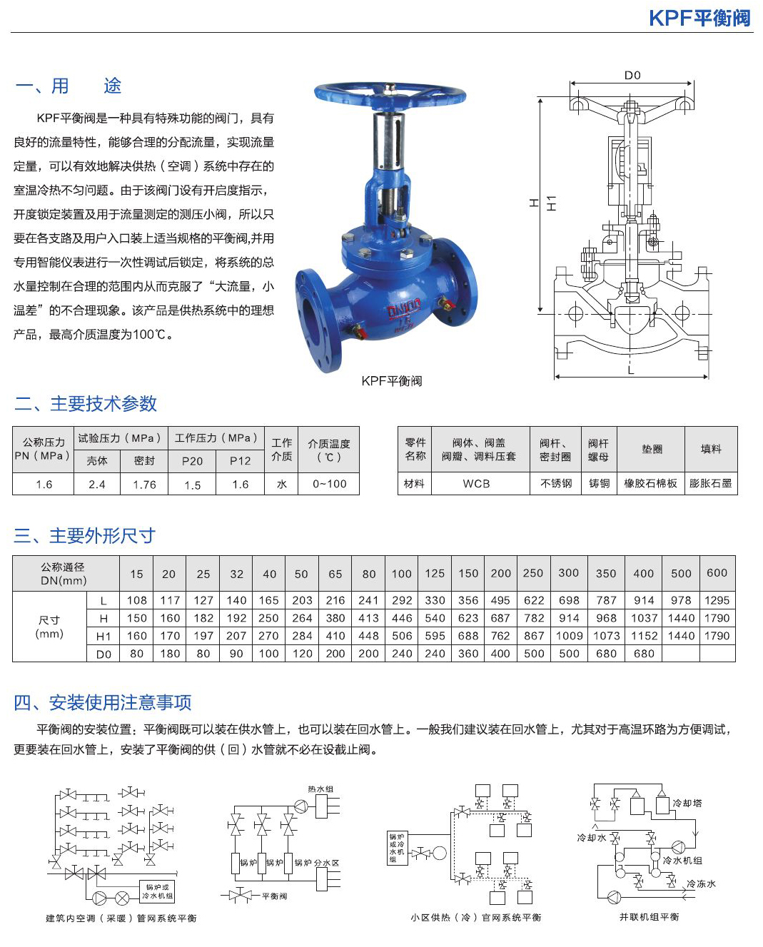 - KPF平衡閥是一種具有特殊功能的閥門(mén),具有良好的流量特性,能夠合理的分配流量,實(shí)現(xiàn)流量定量,可以有效地解決供熱(空調(diào))系統(tǒng)中存在的室溫冷熱不勻問(wèn)題。
