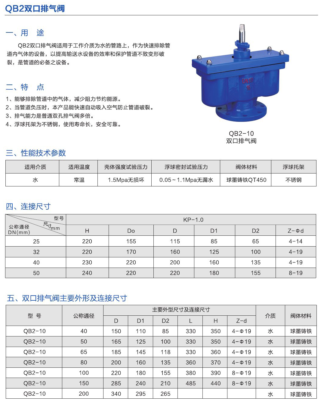 - QB2-10雙口排氣閥適用于工作介質(zhì)為水的管路上,作為快速排除管道內(nèi)氣體的設(shè)備,以提高輸送水設(shè)備的效率和保護管道不致變形破裂,是管道的必備之設(shè)備。