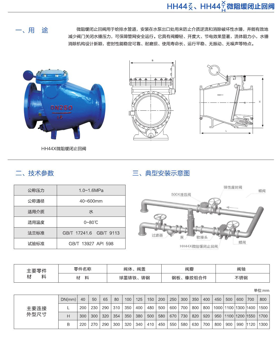 - 微阻緩閉止回閥用于給排水管道,安裝在水泵出口處用來(lái)防止介質(zhì)逆流和消除破壞性水錘,并能有效地減少閥門關(guān)閉水錘壓力,可保障管網(wǎng)安全運(yùn)行。