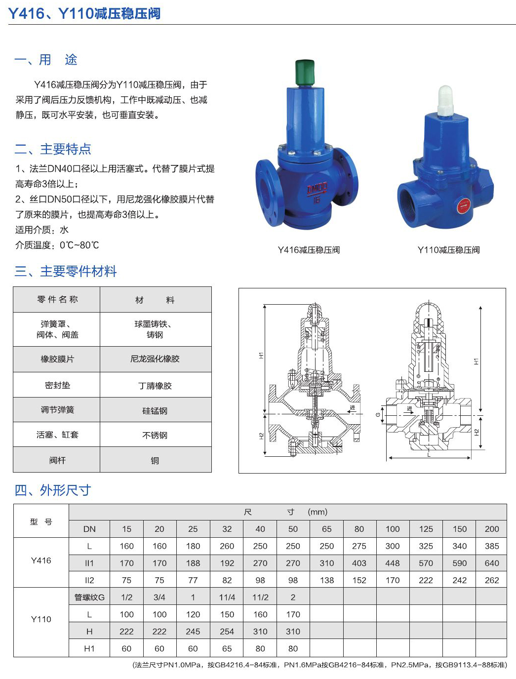 - Y416減壓穩(wěn)壓閥分為Y110減壓穩(wěn)壓閥,由于采用了閥后壓力反饋機(jī)構(gòu),工作中既減動(dòng)壓、也減靜壓,既可水平安裝,也可垂直安裝。