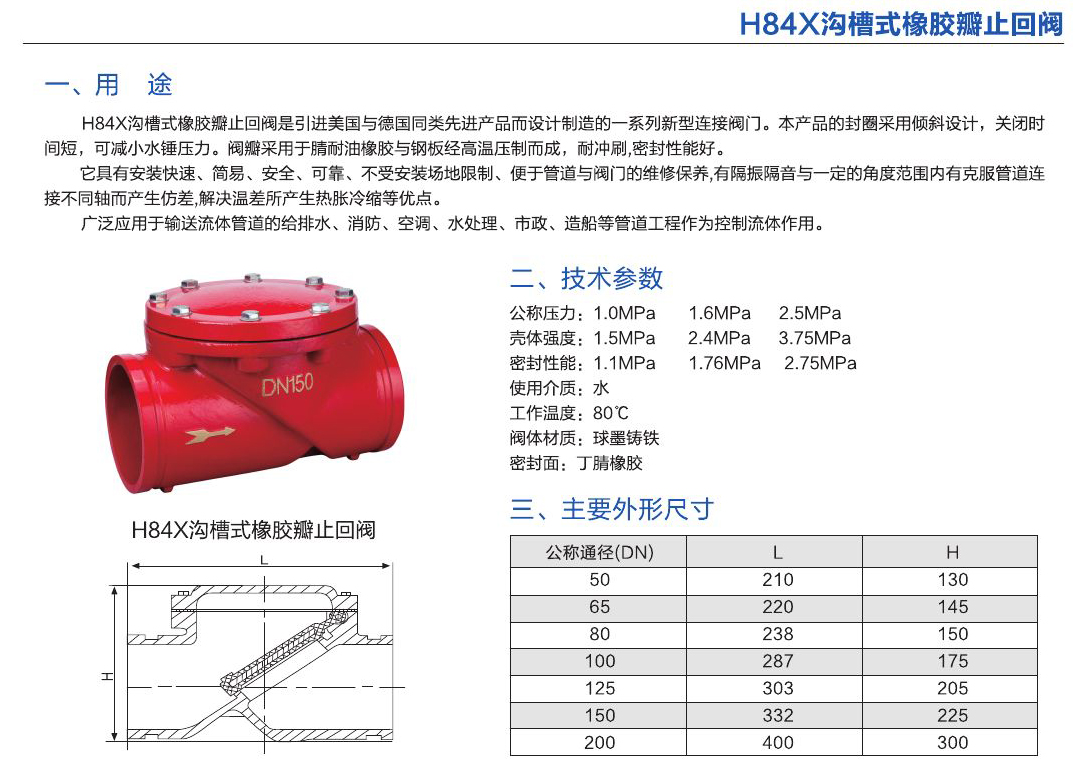 - H84X溝槽式橡膠瓣止回閥是引進美國與德國同類先進產(chǎn)品而設計制造的一系列新型連接閥門。本產(chǎn)品的封圈采用傾斜設計,關閉時間短,可減小水錘壓力。閥瓣采用于腈耐油橡膠與鋼板經(jīng)高溫國壓制而成,耐沖刷,密封性能好。