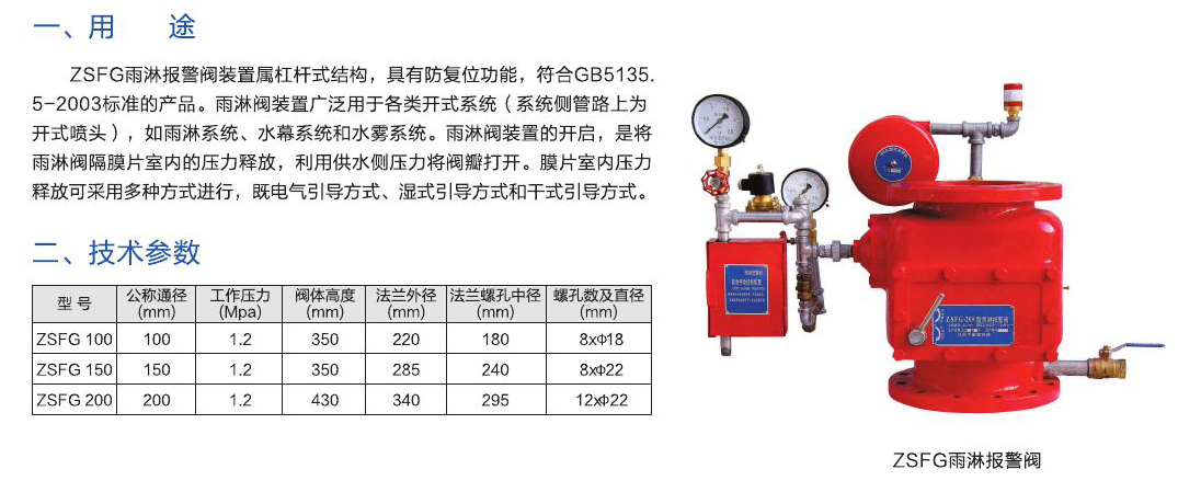 - ZSFG雨淋報(bào)警閥裝置屬杠桿式結(jié)構(gòu),具有防復(fù)位功能,符合GB5135.5-2003標(biāo)準(zhǔn)的產(chǎn)品。雨淋閥裝置廣泛用于各類開式系統(tǒng),如雨淋系統(tǒng)、水幕系統(tǒng)和水霧系統(tǒng)。