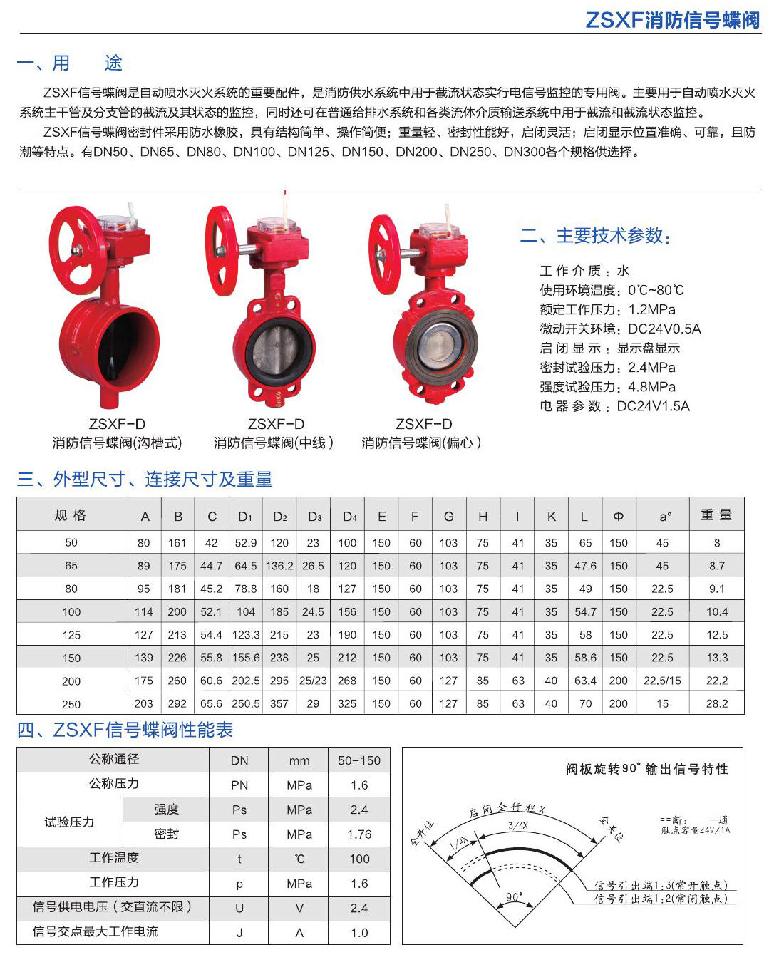 - ZSXF信號蝶閥是自動噴水滅火系統(tǒng)的重要配件,是消防供水系統(tǒng)中用于截流狀態(tài)實行電信號監(jiān)控的專用閥。主要用于自動噴水滅火系統(tǒng)主干管及分支管的截流及其狀態(tài)的監(jiān)控,同時還可在普通給排水系統(tǒng)和各類流體介質(zhì)輸送系統(tǒng)中用于截流和截流狀態(tài)監(jiān)控。