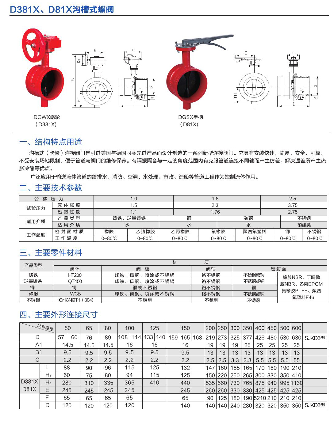 - 溝槽式(卡箍)連接閥門是引進美國與德國同類先進產品而設計制造的一系列新型連接閥門。它具有安裝快速、簡易、安全、可靠、不受安裝場地限制、便于管道與閥門的維修保養(yǎng)。有隔振隔音與一定的角度范圍內有克服管道連接不同軸而產生仿差,解決溫差所產生熱賬冷縮等優(yōu)點。