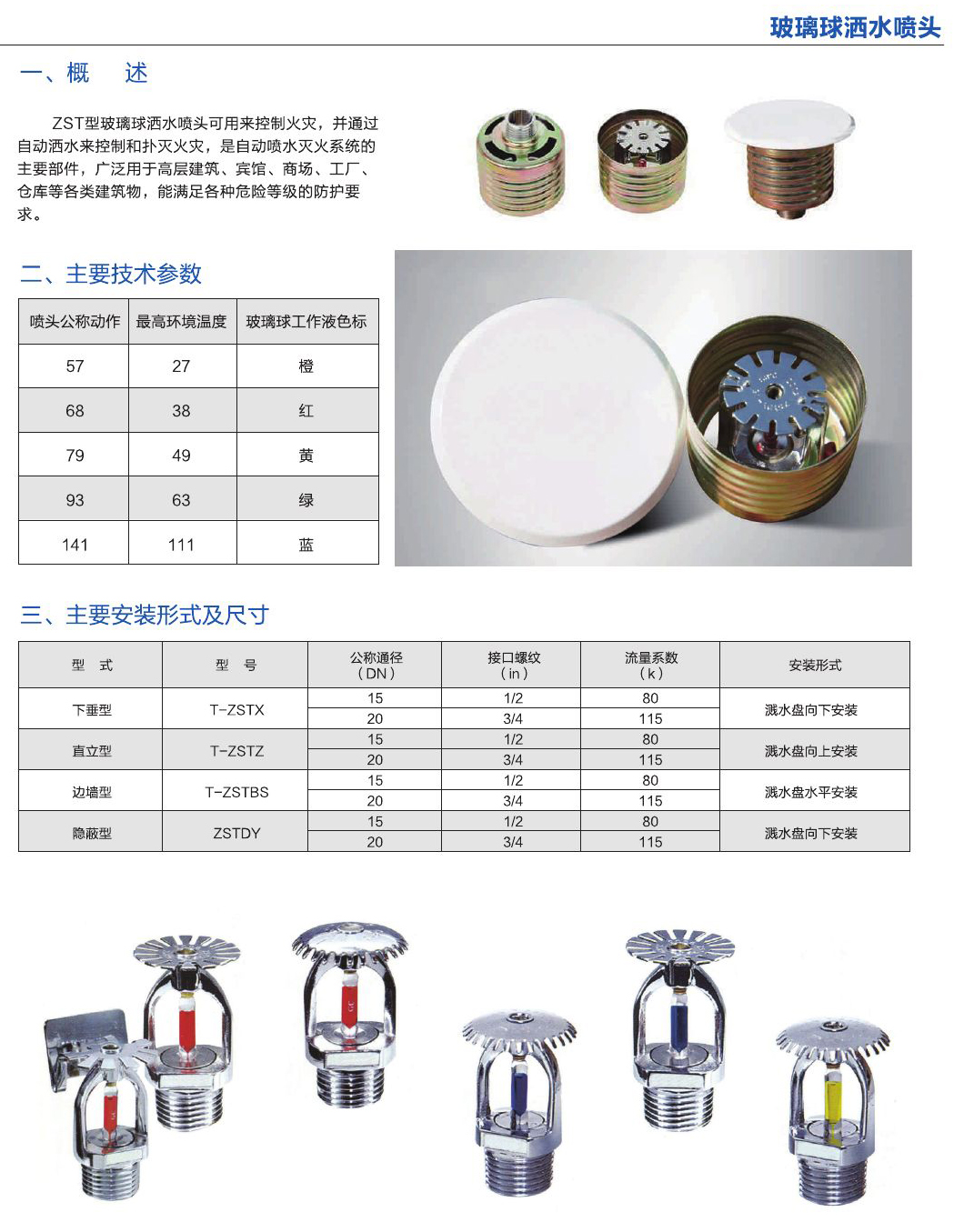 - ZST型玻璃灑水噴頭可用來(lái)控制火災(zāi),并通過(guò)自動(dòng)灑水來(lái)控制和撲滅火災(zāi),是自動(dòng)噴水滅火系統(tǒng)的主要部件,廣泛用于高層建筑、賓館、商場(chǎng)、工廠、倉(cāng)庫(kù)等各類建筑物,能滿足各種危險(xiǎn)等級(jí)的防護(hù)要求。