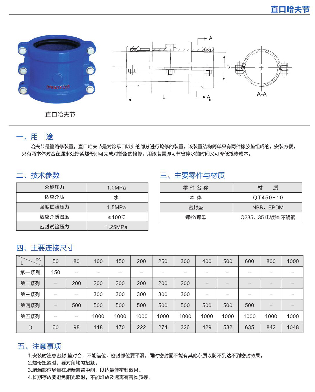 - 哈夫節(jié)是管路搶修裝置,直口哈夫節(jié)是對(duì)除承口以外的部分進(jìn)行搶修的裝置,該裝置結(jié)構(gòu)簡(jiǎn)單只有兩件橡膠墊組成的,安裝方便,只有兩本體對(duì)合在漏水處擰緊螺母即可完成對(duì)管路的搶修,用該裝置即可節(jié)停水的時(shí)間又可降低搶修成本。