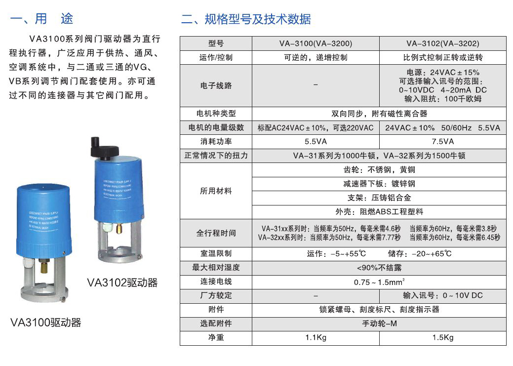 - VA3102系列閥門驅(qū)動器為直行程掃行器,廣泛應(yīng)用于供熱、通風(fēng)、空調(diào)系統(tǒng)中,與二通或三通的VG、VB系列調(diào)節(jié)閥門配套使用。